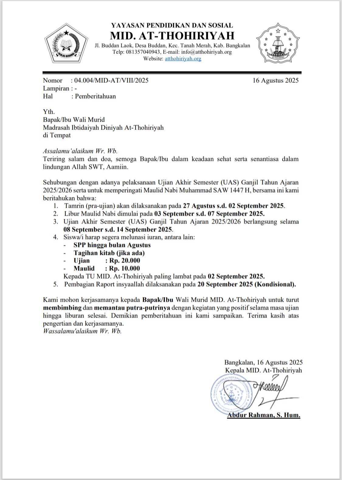 <p>Surat pemberitahuan tentang pelaksanaan Ujian Akhir Semester I T.A. 2025-2026 dan Maulid Nabi Muhammad SAW. 1447 H<p>Silahkan unduh <a href="https://drive.google.com/file/d/1N_LDaO6gJGESPIY4Exxcjg6N0FjKUJ2I/view?usp=drivesdk">disini</a></p></p>